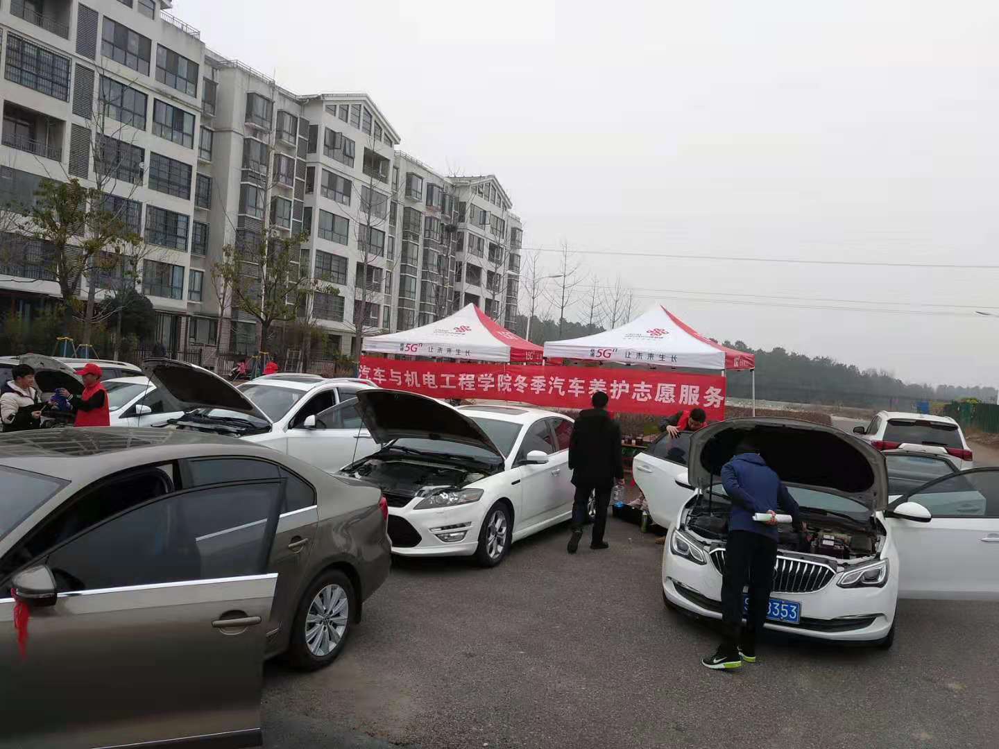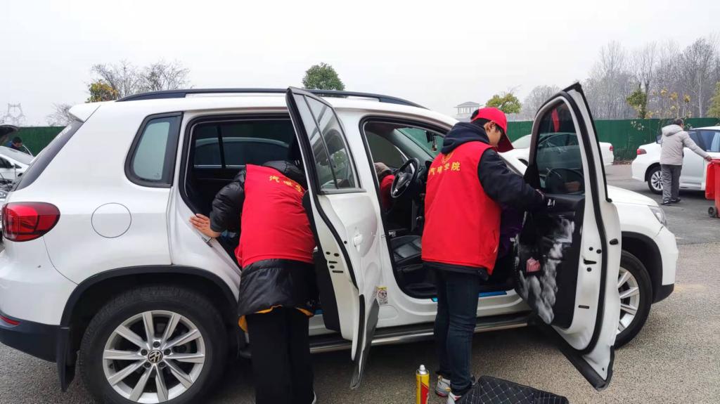 在活动现场不断有闻讯前来进行汽车养护的教职工和龙飞苑家属,志愿者们热情接待,有条不紊地对每一辆车进行登记、检测、养护。大家在党员教师杨自斌、罗锦锋的专业指导下进行规范操作,在操作过程中充分发挥了自己的专业知识,其中包括内饰清洗、添加玻璃水、塑料件翻新、空调风道清洗除臭等项目。