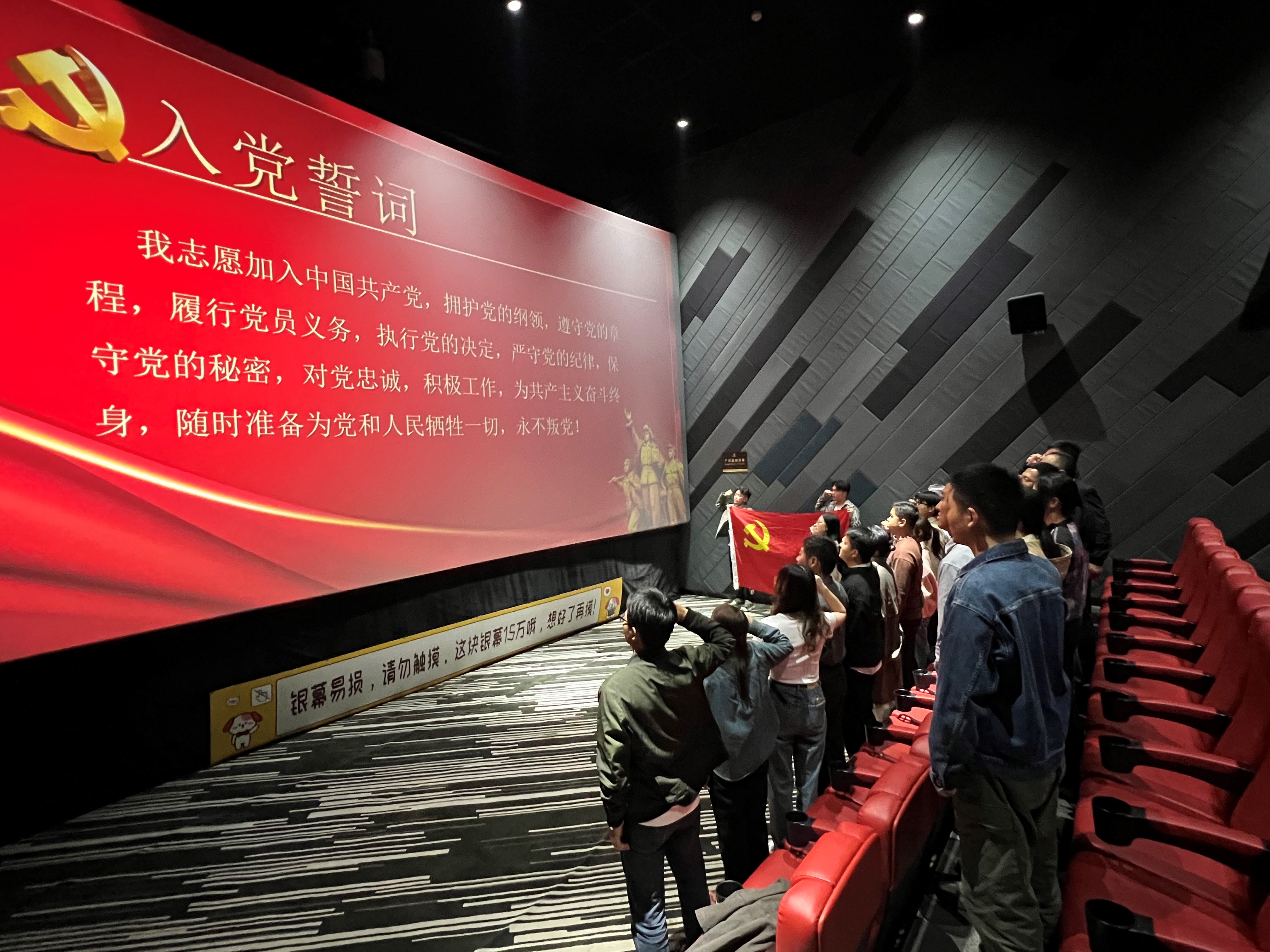 观影结束后,学院党总支书记朱燕鸣带领全体党员在党旗前举起右拳,庄重宣誓,重温入党誓词,牢记作为一名共产党员的使命担当。响亮的声音表明了决心,铿锵的誓言坚定了信念,在回顾历史中重寻初心,在誓言中铭记使命。